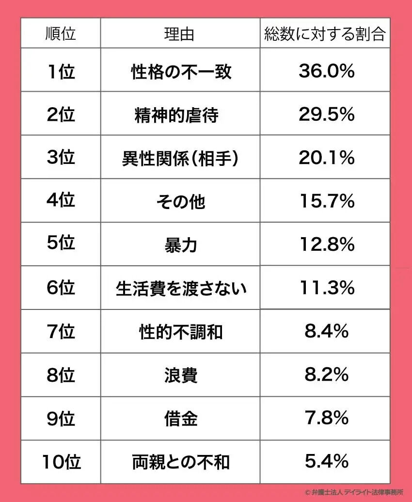 離婚原因ランキング2005の結果では、1位は男女ともに「性格の不一致」でした。。。。。